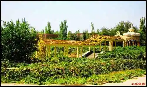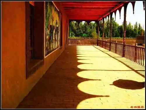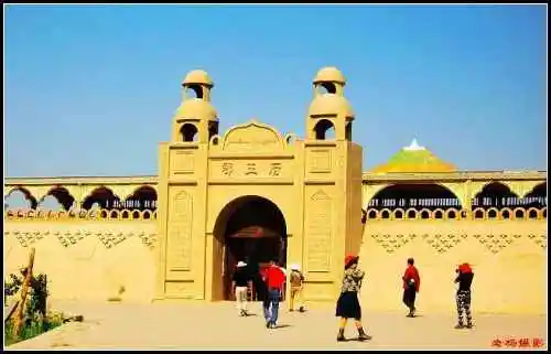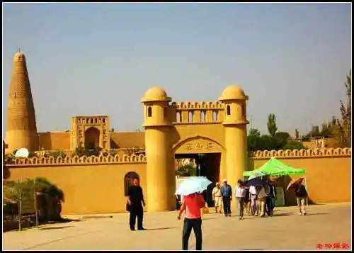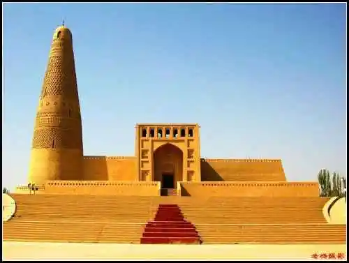 苏公塔又称额敏塔,位于吐鲁番市东郊2公里的木纳村,一座造型新颖别致的古塔,它是新疆境内现存最大的古塔,全部用青灰色砖建成。高44米,塔基直径为10米,塔身下大上小,呈园锥形。塔身周围不同方向和高度,设有14个窗口。塔的表面分层砌出三角纹、四瓣花纹、水波纹、菱格纹等15种几何图案,具有浓厚的少数民族建筑风格。更妙的是塔的内部结构,不用一根木料,而是在塔的中心用砖砌出72级螺旋式阶梯当作中心柱体,既代替木结构支撑加固了塔身,又可作梯攀登通达塔顶,这是木材奇缺的吐鲁番维吾尔族建筑大师们创造的具有少数民族建筑风格的艺术珍品。距苏公塔不远是郡王府。郡王府大门及院墙造型别具一格,具有浓郁的少数民族风格,院内、前后宫殿共有大小房间数十间,天棚、拱廊、楼梯、栏杆和檐口用典型的维吾尔民族工艺进行雕刻,配以石膏花饰,极具民族风味。