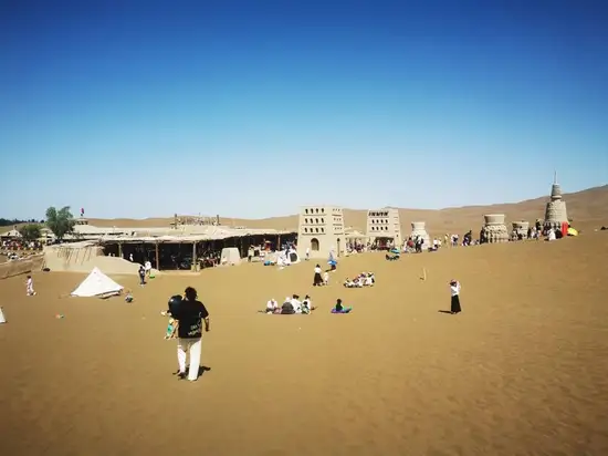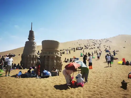 鄯善市是离沙漠最近的城市 交警指挥着来往的车辆 人还不老少呢 卖票的几个桌子拍成一排 大家都是网上买票 大约十来分钟 我们带着宝宝 坐着景区车绕过湖边 来到沙漠里的服务区 有人在享受阳光的温度 有人躲在凉棚吃雪糕 有人在努力滑沙 有人在放风筝 有人在玩堆沙 有人在沙里嬉闹 有人在玩沙车 有人骑着骆驼 有人沿着沙脊往沙山顶走 大家随心所欲放松自己 在沙里走路 真是费劲 深一脚浅一脚的 一会就满头大汗 不如坐在热热的沙子里晒太阳