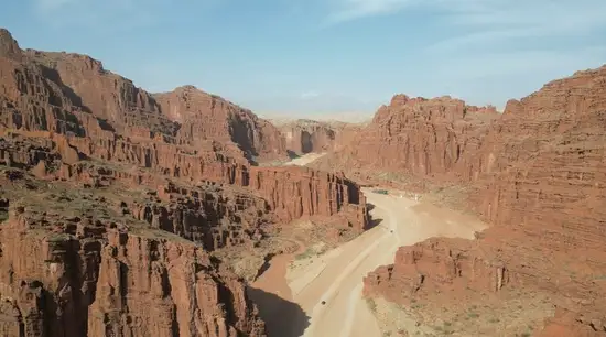 2 号谷 - 天堑谷:属于典型的雅丹地貌,褚红色的山体浓烈艳丽,峡谷里耸立的石柱形态万千,有的如利剑直插云霄,有的又如教堂般庄严神圣。