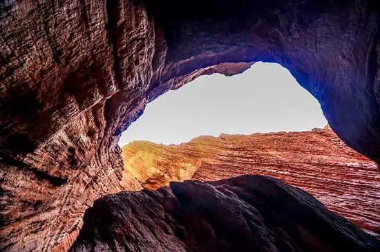 整个峡谷犹如一条尾震天山头,口饮库河流(开口于库车河),曲身九十九的巨龙劈山而卧,呼风唤雨,神秘莫测。更令人称奇的是,距谷口1400米深处,高约35米的崖壁上,有一始建于盛唐时期,壁画丹青的千佛洞遗址,就文字记载和绘画艺术而言,在古西域地区至今已发现的300多座佛教石窟中绝无仅有,实属罕见。无山不成谷,峰奇谷更幽。峡谷区域平均海拔1600米,最高山峰2048米。组成峡谷的奇峰群山由赭色的泥质沙岩构成,当地维吾尔语叫做“克孜利亚,即红色的山崖。