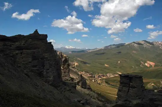 奎克乌苏石林,因位于天山山脉西段、那拉提山北麓的奎克乌苏达坂之下而得名,石林区海拔3500米,长9公里,宽5公里,相对高度30米。石林似林非林,它是由半胶洁的砂砾岩层经外营力的长期雕塑,变得千姿百态,光怪陆离,石林中有“欧州古堡”,肃穆森严,有“宝剑出鞘”,刺破青天,有“行人走兽”,或卧或躺。 其间石窟洞穴比比皆是,像居高临下的亭阁。这里人迹罕至,环境幽静,是野生动物的天堂。关于石窟还有一个英雄尕勒腾为民除妖的传说。优越的自然条件,使石林成为野生动物的“世外桃园”,成群结队的大头羊、鹅喉羚,穿梭石林,栖息繁衍。在雪线附近,可采到雪莲、党参、冬虫夏草等名贵中药。在石林中心,有一泓清潭,人称“鹿镜湖”。水中有一股浓重的硫磺气味,传说是英雄尕勒腾洗火药时留下的气味。