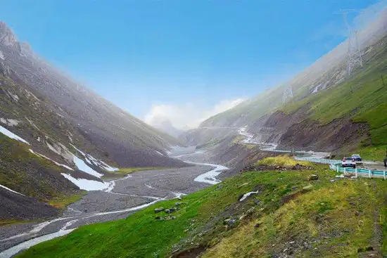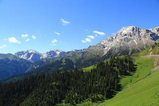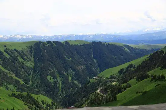 库车河一直伴随在公路一侧,当公路通过天山南麓的"火焰地带"后,取而代之的是陡峭的岩壁,绿色的草,满树激情盛开着黄色花儿的荆棘,以及零零落落的松树。山谷中弥漫着野花芳香,高耸入云的山峰上驻留着寒气逼人的白雪。