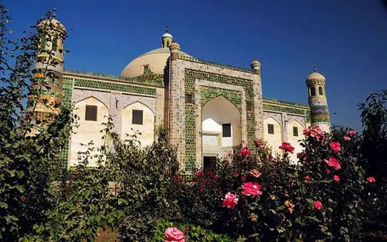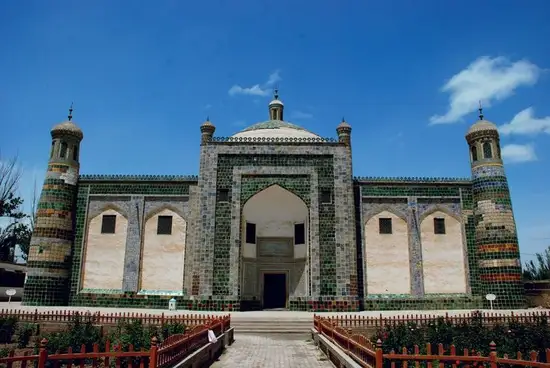 阿帕霍加墓又名香妃墓,位于喀什市东北5公里处的浩罕村,占地面积30亩,始建于1640年前后,距今已350多年,是一座典型古老的陵墓建筑。据说,墓内葬有同一家族的五代共七十二人,第一代是著名的传教阿吉.买合买提.玉素甫霍加。其长子白山派首领阿帕霍加亦葬于此。因其声望高于其父,故墓名改为现名。现为国家级重点文物保护单位。陵墓由门楼、小礼拜寺、大礼拜寺、教经堂和主墓室5部分组成。主体建筑主墓室在陵园东部,造型宏伟壮观,风格庄严华丽,为整个建筑群之冠,也是新疆最为宏大精美的陵墓,主墓方体圆顶,高26米,底面横长39米。其圆拱直径达17米,无任何梁柱;墓室四周的墙上,由绿色硫璃砖贴面,间以黄蓝二色瓷砖镶嵌,瓷砖表面绘有彩色图案,还有阿拉伯文警句。墓室内的墓台上,排列着白底兰花硫璃砖包砌的坟丘,晶莹素洁。传说霍加后裔中,有一个叫伊帕尔汗的女子,是乾隆的妃子。由于她身上有一股浓郁沙枣花香,人们称之为“香妃”。香妃死后亦葬于此,故人们又称该墓为“香妃墓”阿帕霍加墓是我国古代维吾尔族建筑艺术的典范。