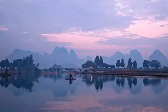 早餐后乘船游览桂林【市区水上游】(70分钟左右,码头:龙船坪-叠彩山),临风而立,凭栏远望,满眼风光如画——桂林城徽{象鼻山},神奇传说{伏波山}、江山汇景处{叠彩山}、斗鸡山、穿山、塔山、七星山、老人山等。乘车赴阳朔(68KM, 车程80分钟,全程二级公路),车览阳朔著名景区十里画廊及电影《上甘岭》的外景拍摄地【遇龙河风光】,听导游述说骆驼过江等古老传说;远观月亮山的阴晴圆缺;自由漫步洋人街(50分钟),感受中国民族元素与西方艺术相碰撞的气息氛围。