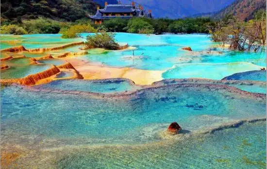 3、乘车约45分钟抵达黄龙,游览【黄龙景区】(门票已含,游览约4小时):景区黄龙沟的数千个钙化彩池形态各异,流光泛彩,长达2500米的钙化硫是世界之最,沿途主要景点有洗身洞、金沙铺地、盆景池、黄龙洞、黄龙寺、石塔镇海、五彩池、转花玉池等,游览时请量力而行(可自费乘索道上下,上80/人,下40/人),后集合乘车前往茂县入住酒店(车程约2.5小时)。