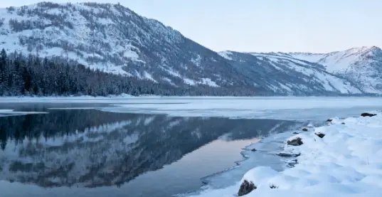 站在湖边,凛冽的寒风扑面而来,却也让人更加清醒地感受到大自然的宁静与美好。沿着湖岸漫步,脚下是咯吱作响的积雪,眼前是如梦似幻的湖景,耳边是寒风吹过发出的呼啸声,仿佛是大自然在诉说着古老的故事。远处的山峦连绵起伏,与湖面相接,构成了一幅浑然天成的山水画卷。