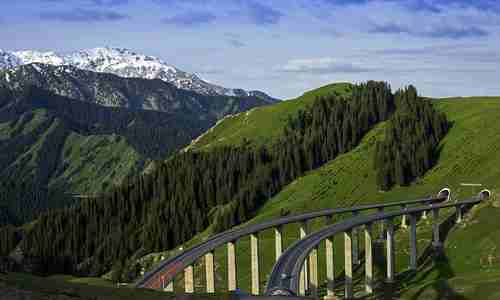 果子沟:国内第一座公路双塔双索面跨山斜拉大桥,沿途欣赏伊犁第一关果子沟秀美风光(由于全线高速 不得停车),果子沟以野果多而得名,沟内峰峦耸峙、峡谷回转、松桦繁茂、果树丛生、野花竞放、飞瀑 |