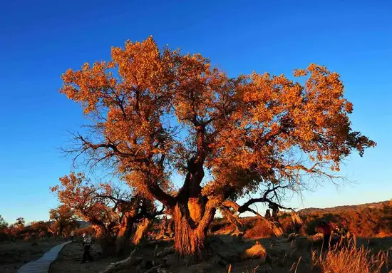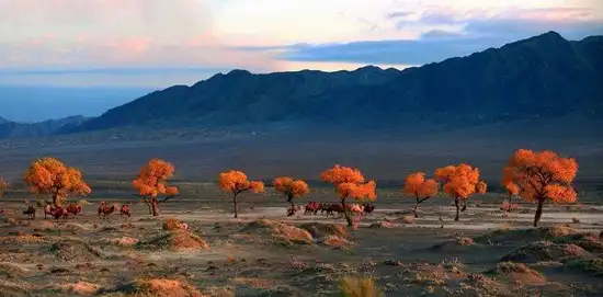 早乘旅游空调车前往丝路新北道重镇——新疆木垒胡杨林鸣沙山风(70元/人)胡杨林及鸣沙山若乘坐大巴车进入。景区一望无际的沙漠戈壁,野骆驼群,觅草的黄羊,神奇的海市蜃楼,使人目不暇接,心旷神怡,沿途观赏天山北坡自然风光。午餐后乘车抵达千年原生态胡杨林景区,观赏胡杨落日景观,住景区接待中心(毡房)。
