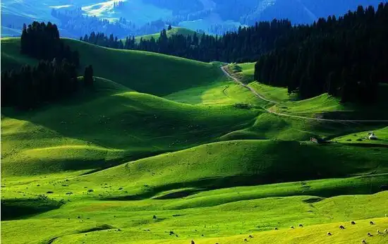江布拉克是哈萨克语,意为圣水之源。她集结了天山之灵气,并融入诸多美丽的传说。在这里,远山近水相映,林海雪峰交融,绿波花海如潮,一派圣洁的自然风光。